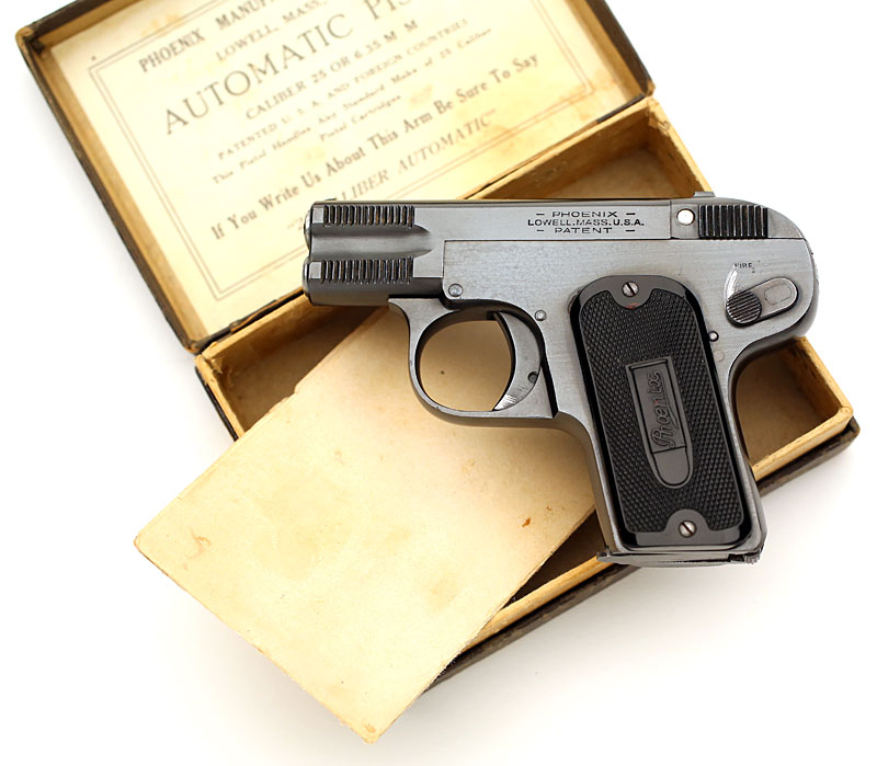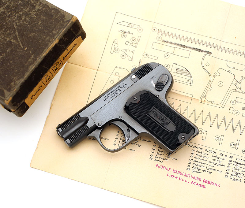 Phoenix Automatic 25 Cal/6.35 Automatic serial number 273 - Manufactured circa 1920 by Robar et DeKerkhove in Liege, Belgium and imported by Phoenix Arms Co. in Lowell, MA. In original box (numbered to the gun) with factory parts sheet stamped PHOENIX MANUFACTURING COMPANY, LOWELL, MASS.