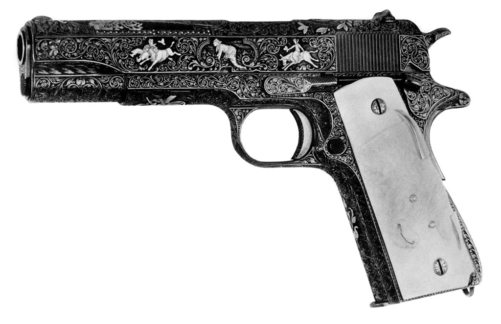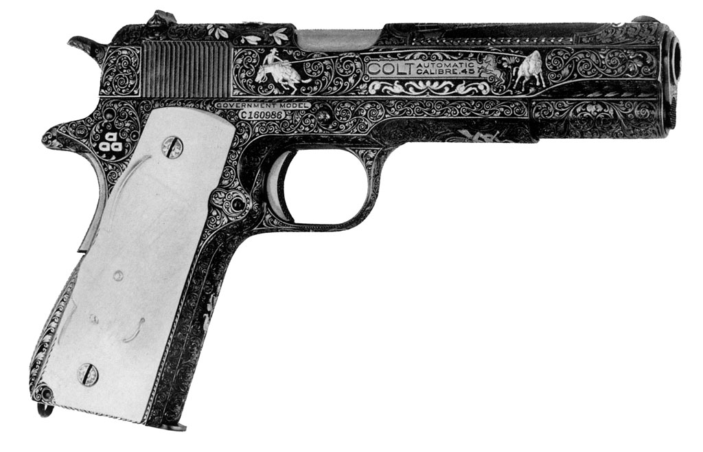 Colt Government Model serial number C160986 - Perhaps the most elaborately factory engraved Government Model.  This gun was commissioned by a Texas Oilman in 1931.  It addition to full engraving coverage, this pistol also contains several gold inlays and rare double carved steer head ivory grips with gold accents.  This was the sample used by Kornbrath on the front and back covers of his promotional brochure.