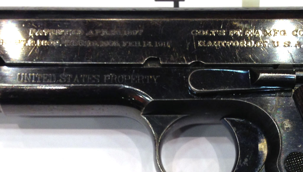 Approximately the first 100 Model of 1911 U.S. Army pistols were marked with the large UNITED STATES PROPERTY roll mark on the left forward flat of the frame.