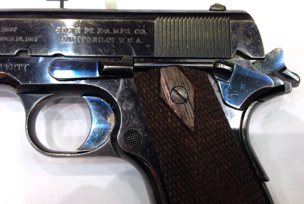 Left side close-up.  Colt logo in a circle on the left side of the slide behind serrations until January 1913, approximately serial number 20000.