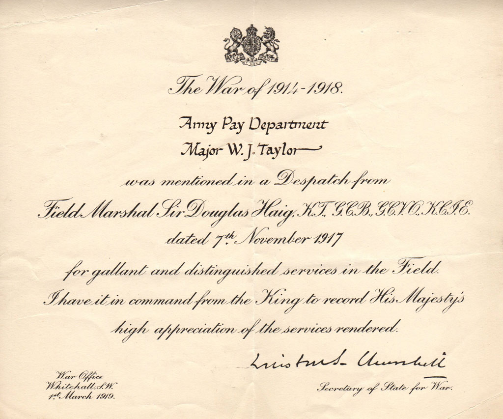 Major Taylor was mentioned in two dispatches