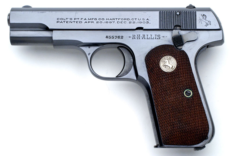 December's Gun of the Month is a factory inscribed Model M like new in the original box with all accessories. The pistol bears the fine hand inscription "->R.H. ALLIS<-" on the left side of the frame behind the serial number. It is believed that Allis was in some way affiliated with the Allis-Chalmers Manufacturing company.