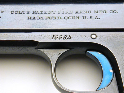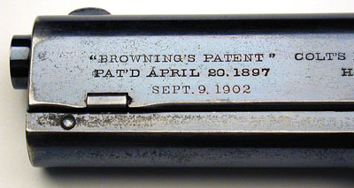 Serial numbers 19999 and 19998 (the first and second pistols produced) are known to collectors. Before the recent discovery of 19984, the three line patent markings (pictured above) were believed to exist only on 19999 as 19998 has the April 20, 1897 and Sept. 9, 1902 patent dates on the same line.