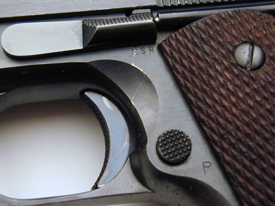 Left side. ![]() The initials of Major Charles S. Reed, Officer in Charge of Outside Inspection, were stamped on all M1911A1 pistols manufactured in 1940, signifying government acceptance of the pistol. His initials were stamped on the left side of the receiver below the slide stop in accordance with Ordnance drawings. The were also stamped on the top of the receiver near the disconnector hole to indicate provisional inspection, replacing the previous letter "R" within an oval.