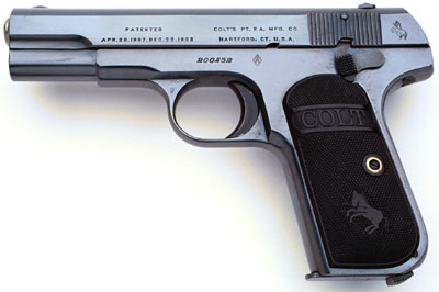 Tin Shipping Box - In 1915, Colt's used a tin two piece shipping box for some overseas (Belgian) and domestic shipments. The boxes were painted maroon (to resemble the standard cardboard hinged shipping box) and contained the standard labels of the day. The end label extended under the bottom of the box so that the serial number could be hand written in the standard location.