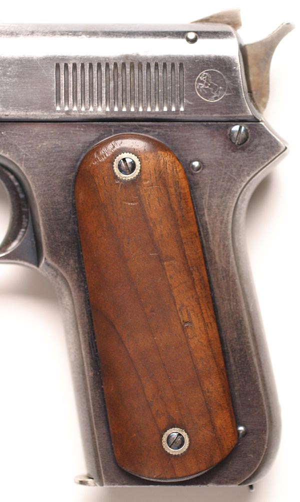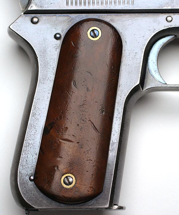 Left grip profile - early Model 1900 pistols were fitted with smooth walnut grips. Grip screws, hammer screw, pins, trigger, slide lock, magazine release and forward frame plug had a turquoise blued finish.