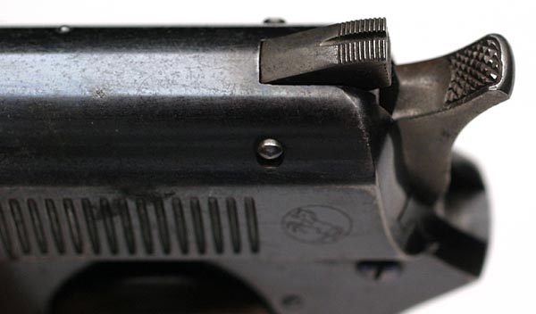 Sight Safety - locked in upward position, this functions as the rear sight. The sight safety and hammer were color case hardened.