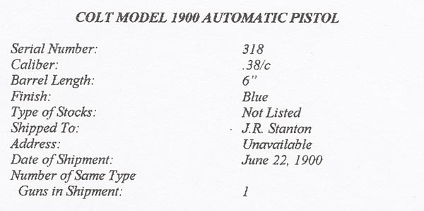 Colt Factory Letter indicates that pistol was shipped June 22, 1900 as a single gun shipment to J.R. Stanton, address unavailable. J. R. Stanton — Appointed Assistant Paymaster, March 25, 1870. Promoted to Passed Assistant Paymaster, November 24, 1878, and promoted to Paymaster, March 26, 1889 ; Navy Yard, Mure Island, August 30, 1870, to September 23, 1871 ; Coast Survey steamer "Hassler," September 8,1872, to January 1, 1876; special service, April 17, 1876, to July 24, 1876 ; U. S. 8. "Dictator," N. A. Station, August 11, 1876, to June 5, 1877 ; "Canonicus," N.A. Station, November 24, 1877, to April 10, 1878 ; New York Navy Yard, November 1, 1878, to May 9, 1879; "Kearsarge," N. A. Station, May 15, 1879, to May 2, 1882; Coast Survey Office, November 1, 1883, to December 31,1886; "Juniata," Pacific Station, June 13, 1887, to March 26, 1889 ; training-ship " Minnesota," April 30, 1889, to December 22, 1890 ; Navy Yard, Mare Island, Cal., December, 1890, to December, 1892; "Mohican," Pacific Station, February, 1893, to date. From The Records of Living Officers of the U.S. Navy and Marine Corps by Lewis Randolph (p. 324)