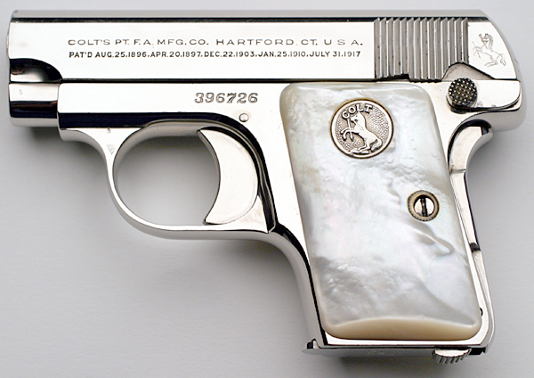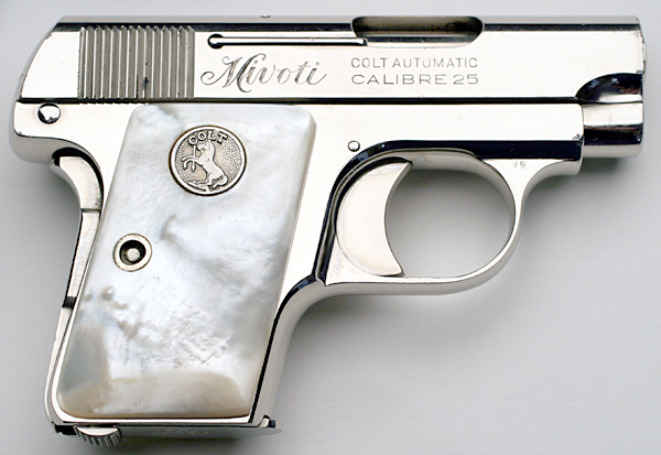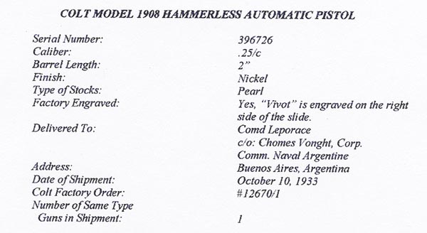 Factory Inscribed Colt Model N Pistol Serial Number 396726 - This pistol has factory nickel finish, factory mother of pearl grips and a factory inscription "Mivoti" on the right side of the slide. Colt Factory Letter confirms finish, grips and inscription (listed incorrectly in letter as "Vivot") and indicates that it was delivered to Comd. Leporace c/o Chomes Vonght, Corp, Comm. Naval Argentine, Buenos Aries, Argentina on October 10, 1933 as a single gun shipment. The work was processed on Colt Factory Order # 12670/1.