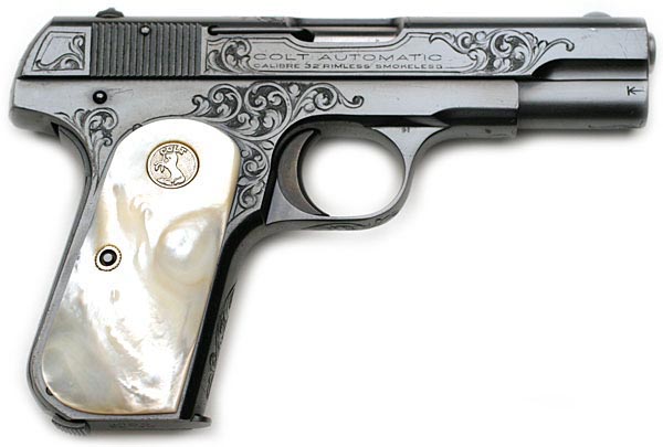 Colt Model 1903 Pocket Hammerless serial number 492737 Exhibition Piece - Factory "A" engraved Model M in .32 caliber. A well traveled pistol which was a factory display piece shipped on "Loan Account" to the following destinations: Wolf & Klar, Fort Worth, TX (6/5/28), Colt's Patent Fire Arms Mfg. Co., Camp Perry, Camp Perry, OH (8/14/29), Shreve & Barber, San Francisco, CA (3/11/31), Murta-Appleton & Co., Philadelphia, PA (2/19/32), Edwards & Walker Co., Portland, ME (3/10/32), Von Lengerke & Antoine, Chicago, IL (4/14/32) and sold to Von Lengerke & Antoine (8/15/34).