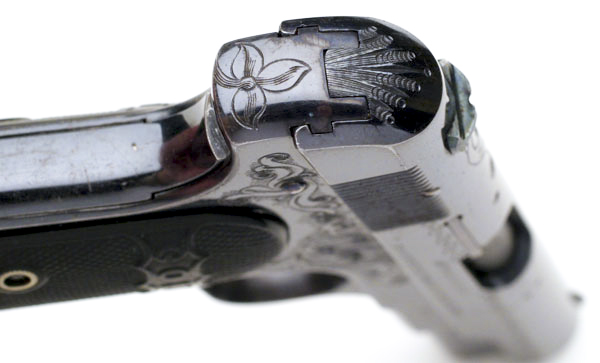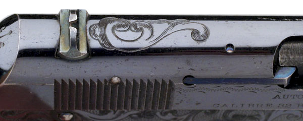 Factory "A" Engraved Colt Model M .32 ACP - serial number 90175. Pistol was shipped blued, factory engraved with hard rubber grips. An unusual example as it contains all early Type III features even though it's in the Type II serial number range (approx. 72,000 - 105,000). Pistols in this range typically have a 3 3/4" barrel with separate barrel bushing. This pistol was one of 72 shipped October 22, 1912 to Norvell Shapleigh Hardware Company, St. Louis, Missouri.