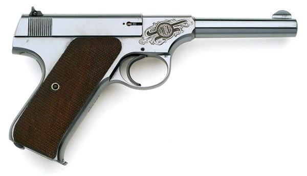 Colt Woodsman Sport .22 LR serial number 118653 - Inscribed "ALC" on the right side of the frame. The elaborate inscription is aftermarket and the gun was shipped December 7, 1937 to Smith & Wesson, Springfield, Massachusetts as a one gun shipment.