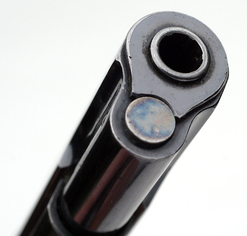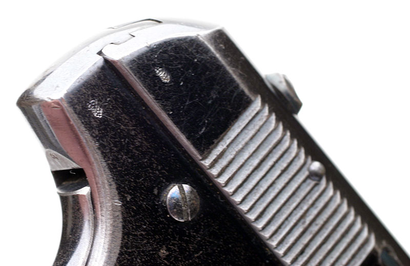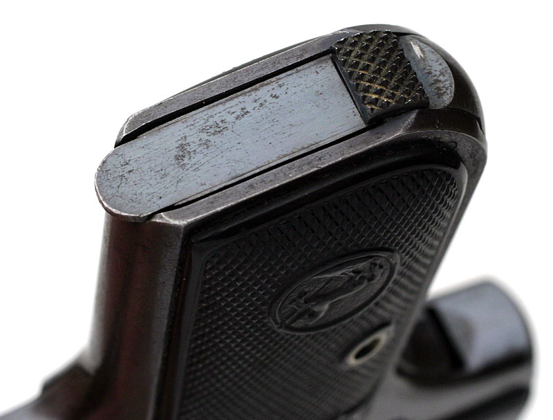 checkered hard rubber grips. Barrel bushing and color case hardened recoil spring plug.