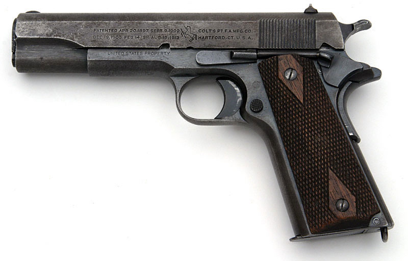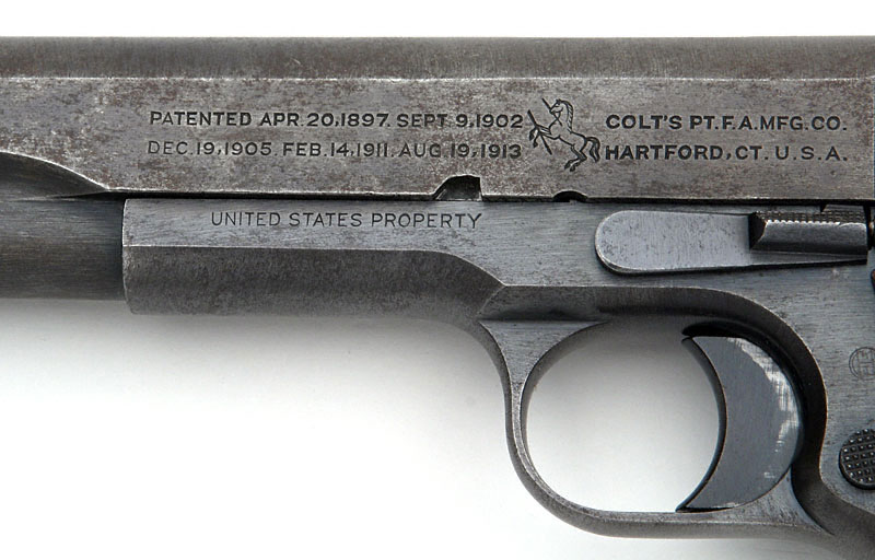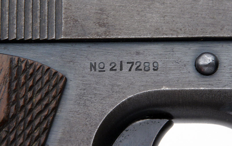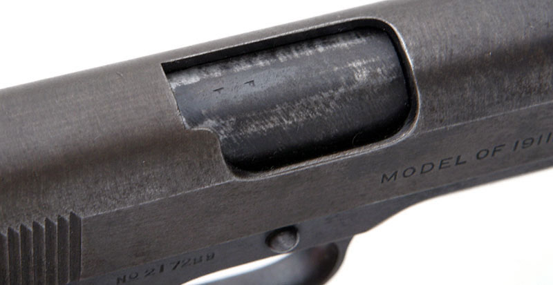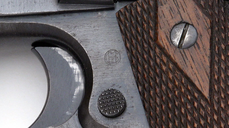 Left side. The mark of Army Inspector of Ordnance Major Gilbert H. Stewart. Stewart inspected these pistols from September 30, 1914 - January 12, 1918. Serial numbers of Model 1911 pistols inspected 101500 - 230000.