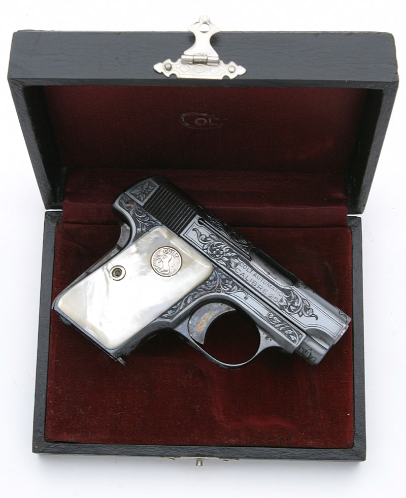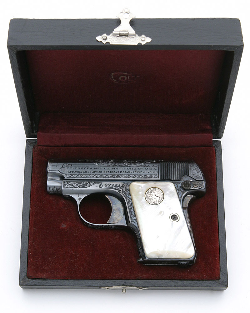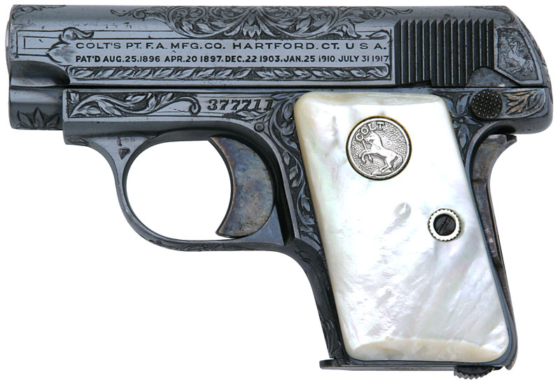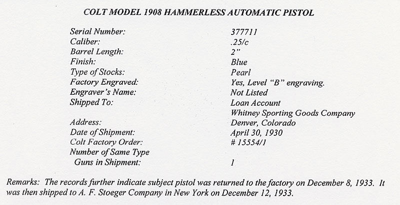 Factory Engraved Colt 1908 Vest Pocket .25 ACP serial number 377711 - Factory "B" engraved, blue finish with flush medallion mother of pearl grips.  Pistol was a single gun shipment shipped to "Loan Account", Whitney Sporting Goods Company, Denver, Colorado on April 30, 1930.  It was processed on Colt Factory Order number 15554/1.  Factory records further indicate that the pistol was returned to the factory on December 8, 1933.  It was then shipped to A.F. Stoeger Company in New York on December 12, 1933.