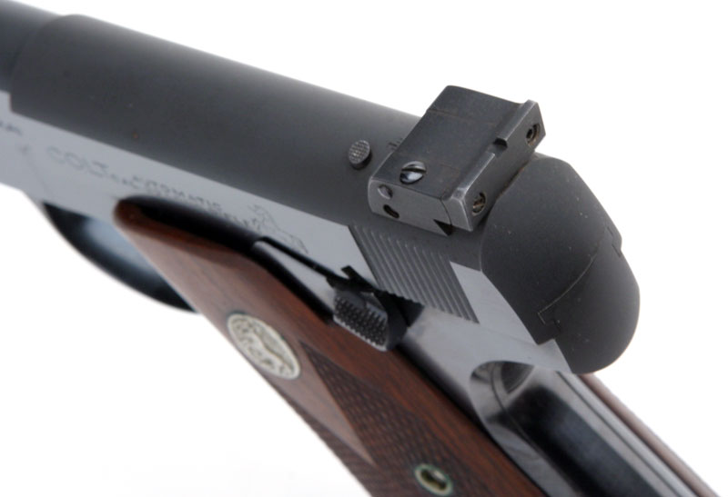 Colt Woodsman Match Target barrel muzzle and front sight. Note how the sight screws are fire blued.