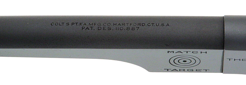 Top of the barrel is rollmarked "COLT'S PT. F.A. MFG. CO. HARTFORD. CT. U.S.A." over "PAT. DES. 110,887"