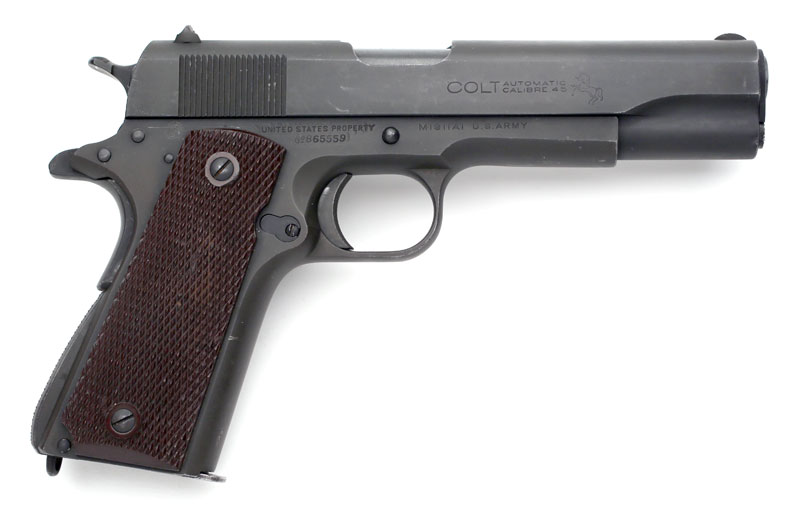 ![]() Colt Model 1911A1 .45 ACP Serial Number 865559 - One of 6,575 unsold commercial Government Model pistols transferred by Colt to their existing Military contract (No. W-478-ORD-1528). The GOVERNMENT MODEL inscription on the frame was removed and was restamped UNITED STATES PROPERTY in its place and M1911A1 U.S. ARMY in front of the pin for the takedown lever. The commercial serial numbers were removed and they were renumbered in the military serial number range beginning with number 860003. Then the guns were parkerized.