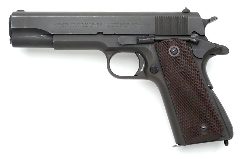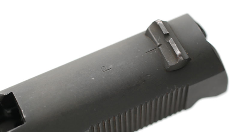 This pistol was manufactured with the Swartz Safety (which was a firing pin block safety added to Government Model pistols around 1938) but the internals have been removed upon conversion to the military contract. This pistol also has the letter S (the commercial sale mark) stamped inside the slide and frame. These pistols have commercial magazines which were also transferred to the military contract. They are full blued, with riveted bases and are marked COLT over .45 AUTO. The bottoms of these commercial magazines have been sandblasted to make them non-reflective. There is a P proof on the top of the slide, in front of the rear sight and alto a P on the left side of the frame near the magazine release button. The barrel in this gun is a commercial barrel marked COLT .45 AUTO on the left side, with the commercial sale mark S in front of the barrel lug on the underside of the chamber. There is no P on the left lug. Gun has Type 2 Coltwood plastic grips with strengthening ribs, mold numbers and large reinforcing rings around screw holes.