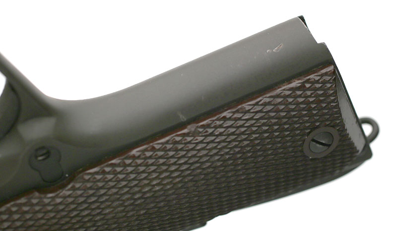 Colt Model 1911A1 .45 ACP Serial Number 865559 - ordnance wheel located behind the right grip. Visible are the rough machining marks which removed the "GOVERNMENT MODEL" and commercial serial number prior to renumbering the gun in the military serial number range. ![]() Rear grip strap retaining virtually all original parkerized finish. ![]() Front grip strap retaining virtually all original parkerized finish.