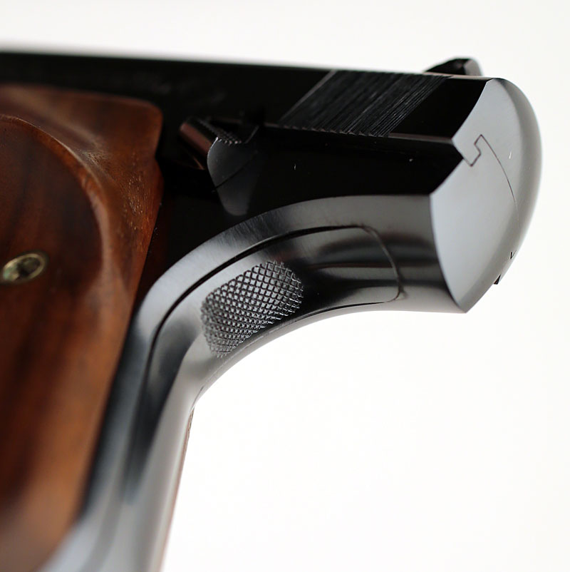 Colt Woodsman Target Pistol .22 LR Serial Number 55070 - Checkered pattern mainspring housing indicating that gun is designed to fire standard velocity ammunition.