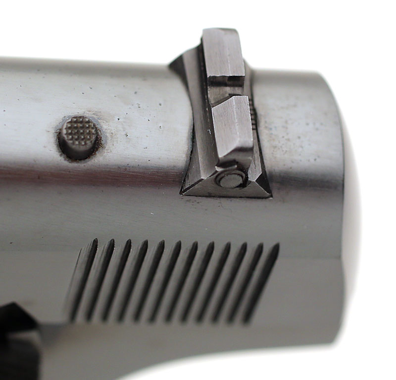 Colt Woodsman Target Pistol .22 LR Serial Number 55070 - Close-up of adjustable front sight with fire blue retaining screws.