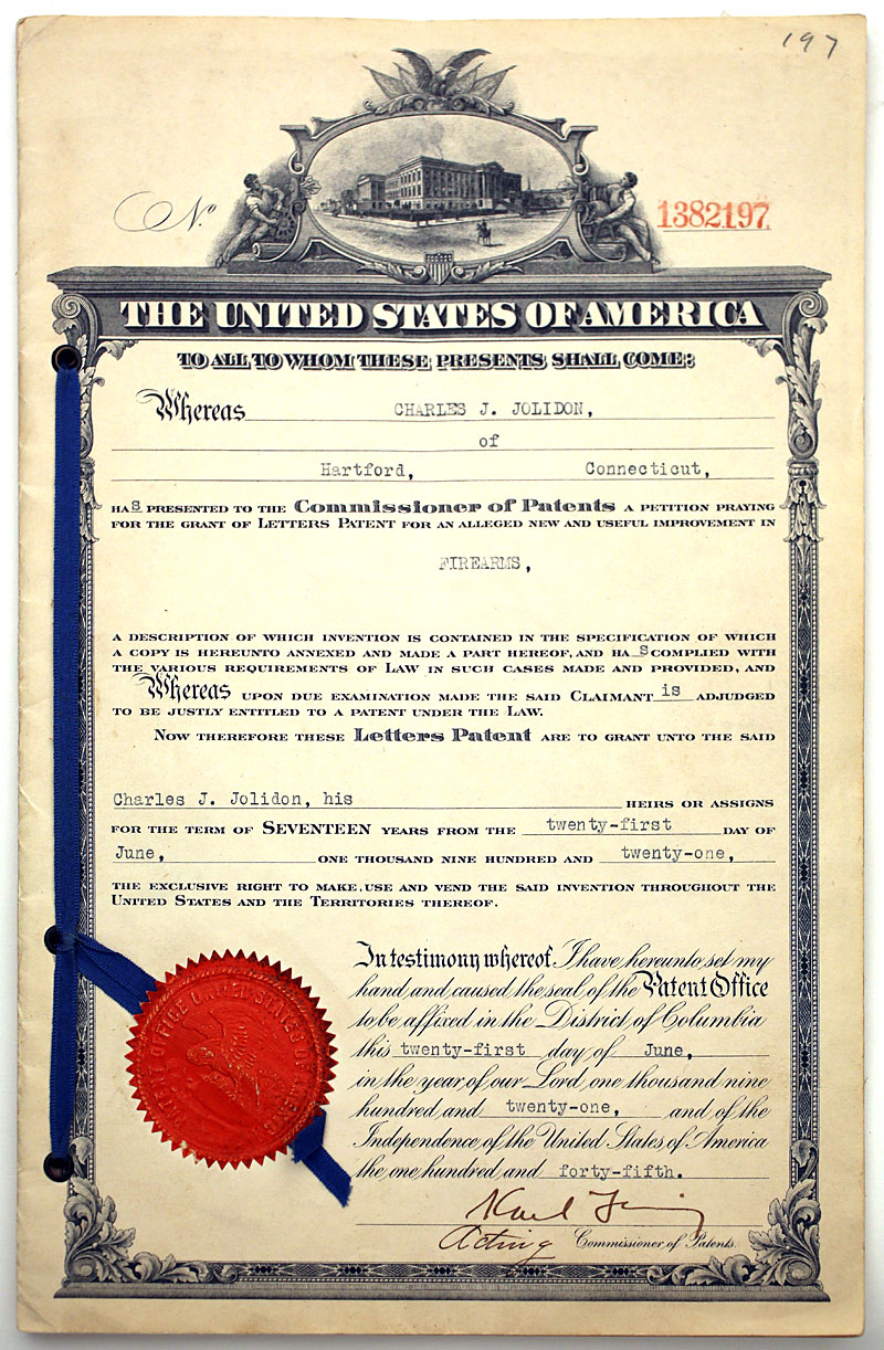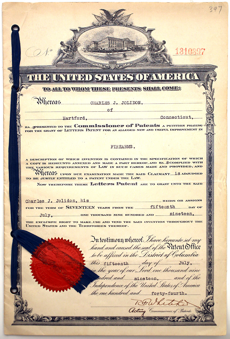 Colt Woodsman Target Pistol .22 LR Serial Number 55070 - An early Model S "Woodsman" in very nice condition. This pistol belonged to firearms inventor Charles J. Jolidon as it was obtained by the previous owner directly from Charles J. Jolidon's son, Charles F. Jolidon. Charles J. Jolidon was a designer of guns and gun improvements and held many patents in his name that were used by Colt and other firearms manufacturers. This Woodsman was accompanied by two original US Patents issued to Charles J. Jolidon: U.S. Patent 1310397 and U.S. Patent 1382197 (pictured with the Colt above and separately below.) Charles F. Jolidon told the previous owner that Colt gave him this gun, along with custom Colt grips made to his hand. Accompanying the gun is a letter from the Colt Historian indicating that they were able to find any shipping information on this gun (which is consistent with there being no VP (Colt's Verified Proof Mark) on the upper left flat of the trigger guard.