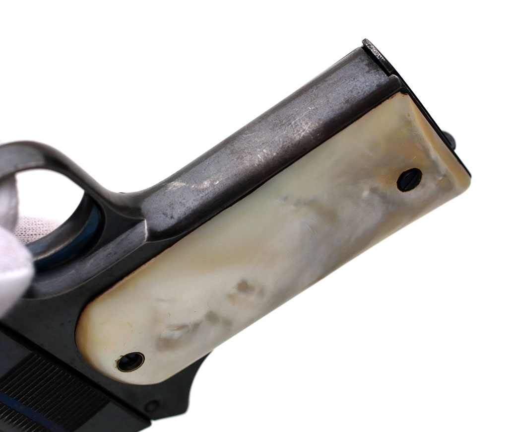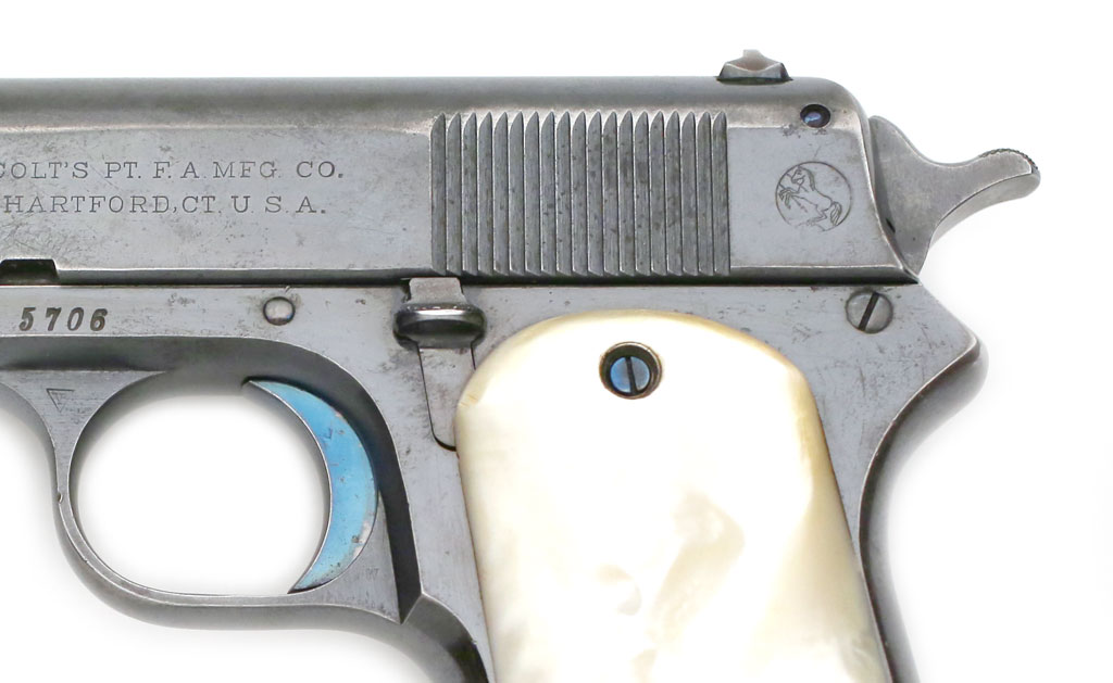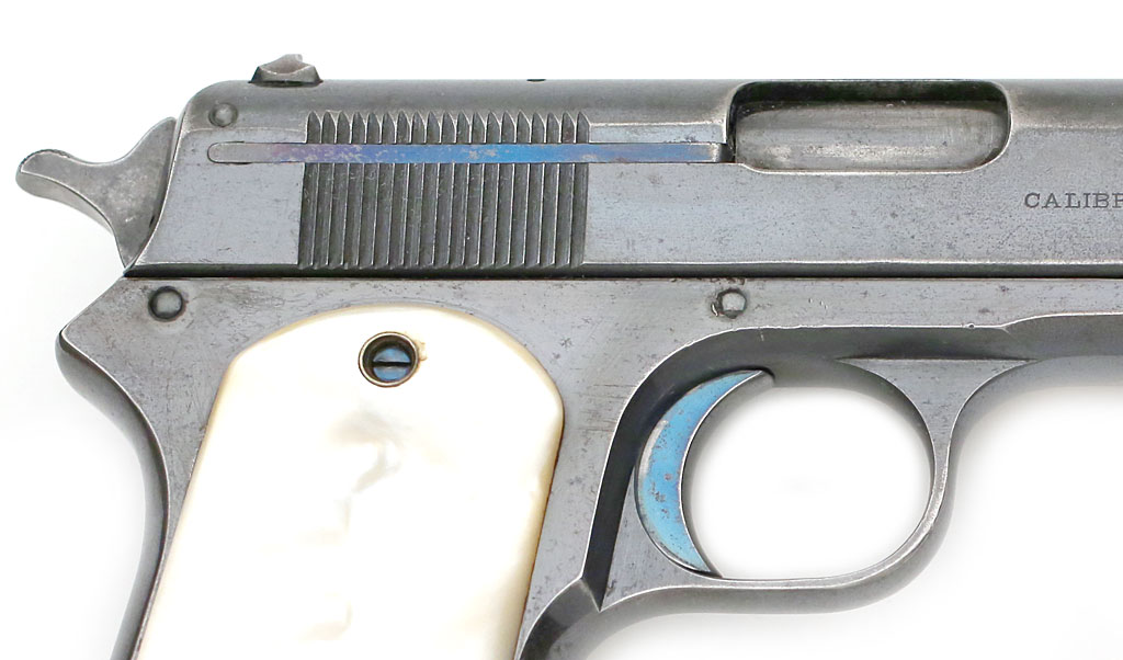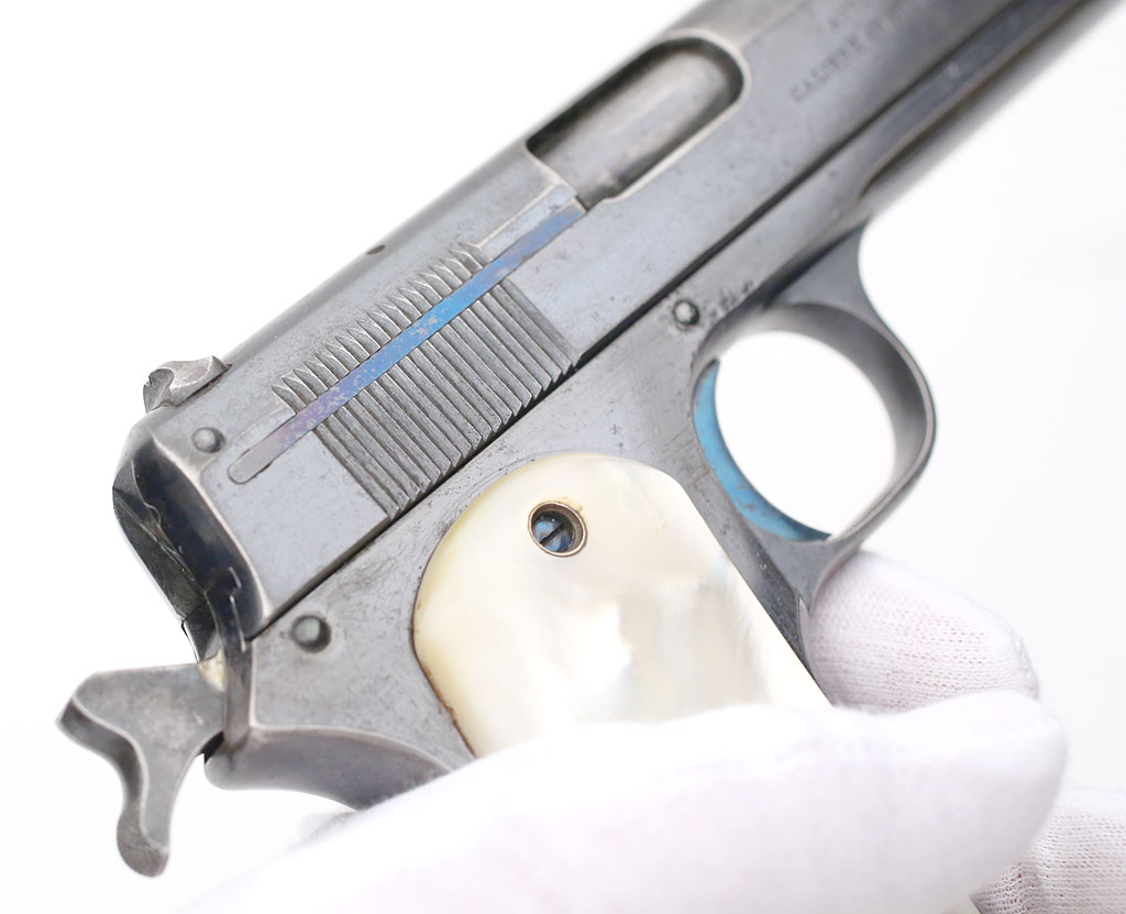 Model 1905 .45 caliber serial number 5706 - close-up of right side, showing fire blue extractor, trigger and grip screws.