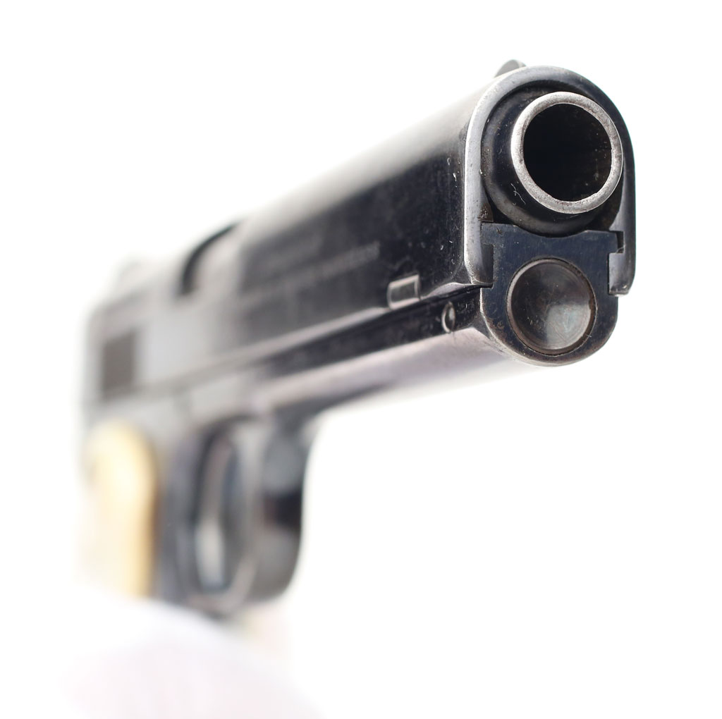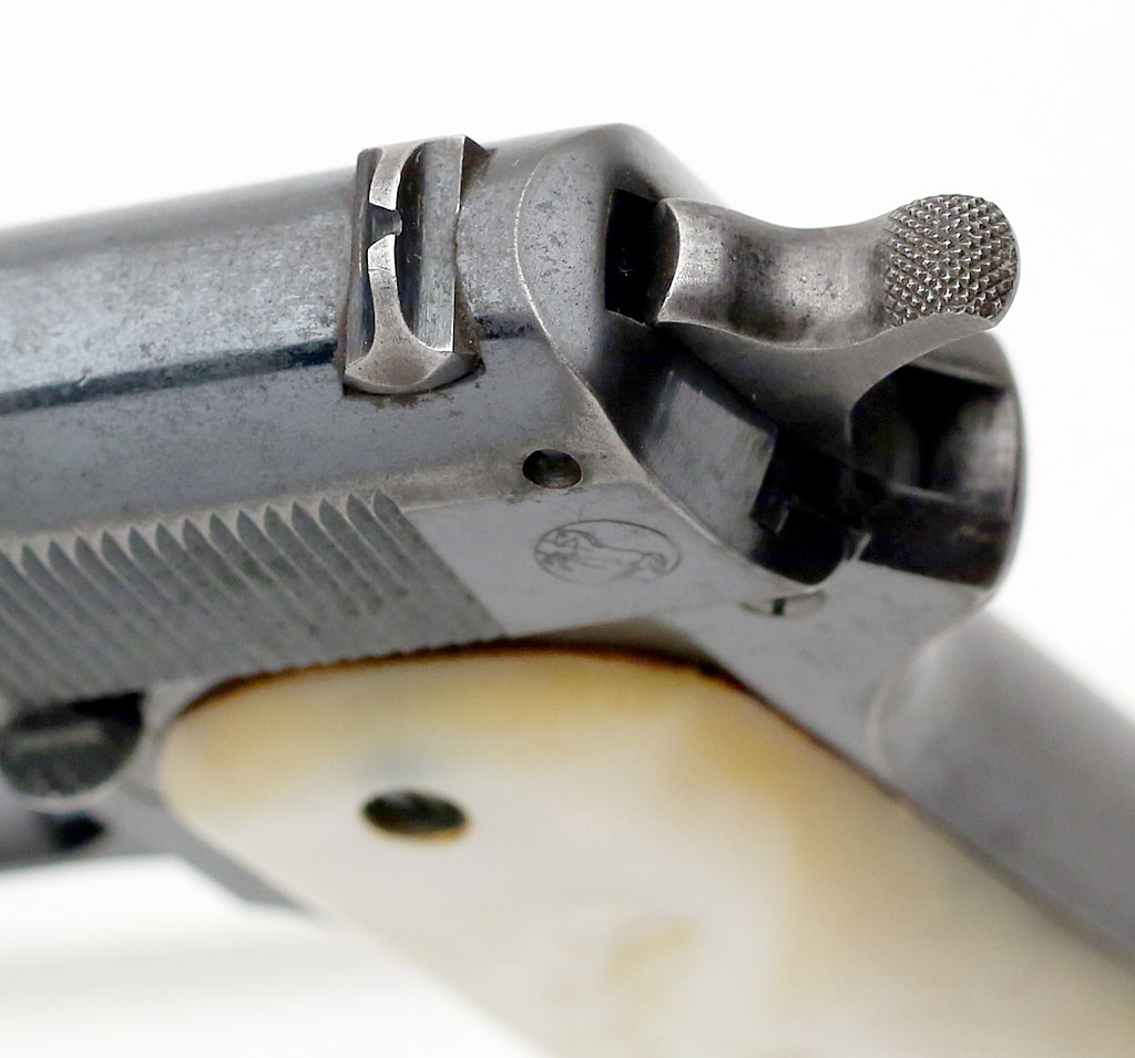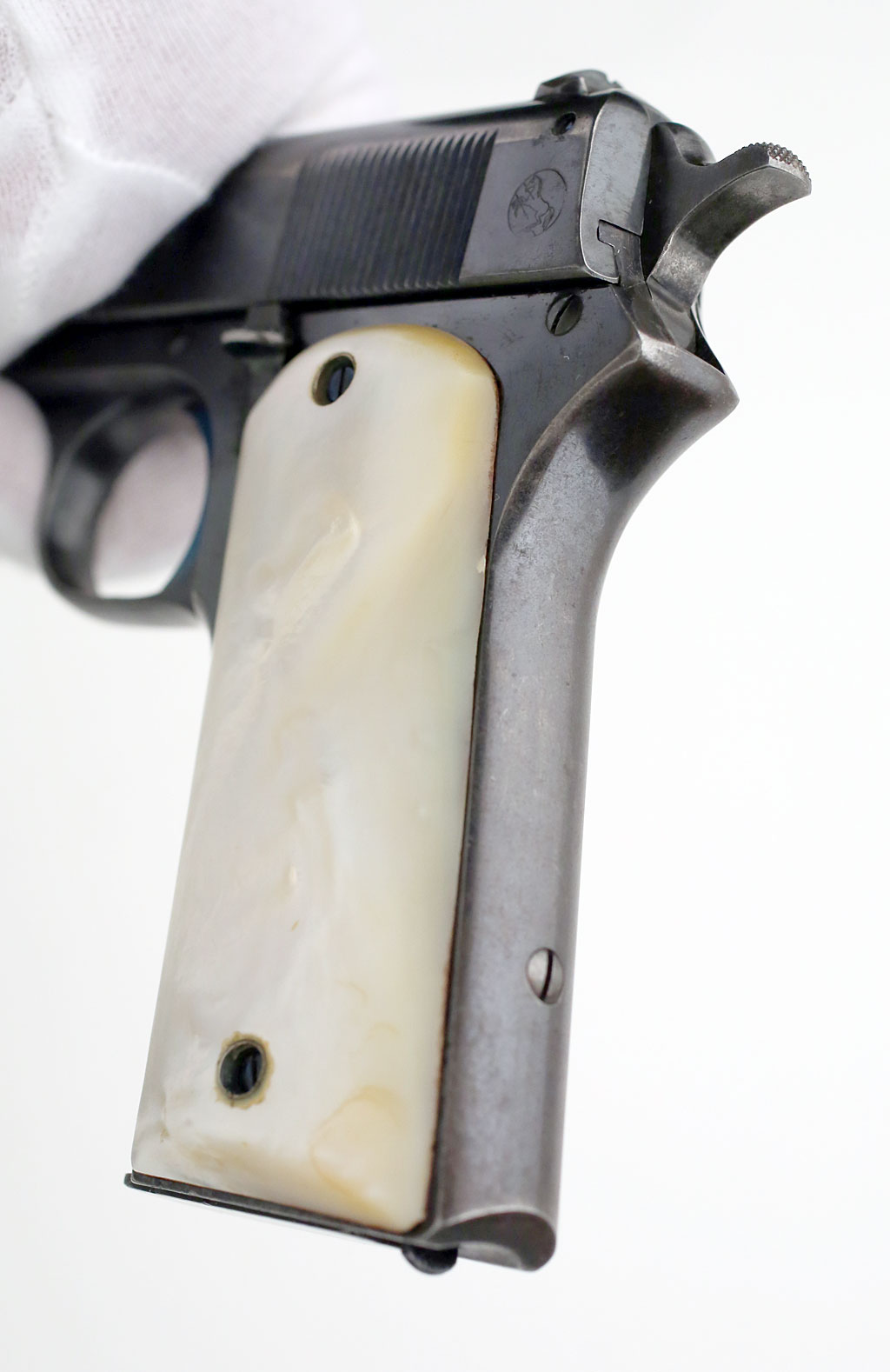 Model 1905 .45 caliber serial number 5706 - close-up of right side, showing fire blue extractor, trigger and grip screws.