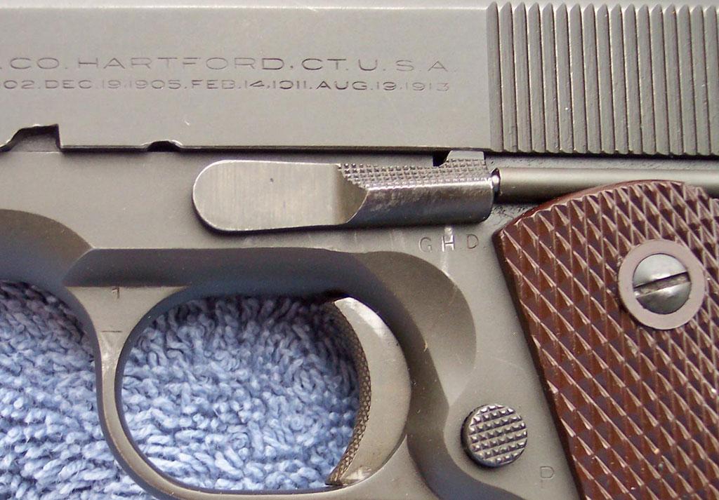 This pistol was manufactured with the Swartz Safety (which was a firing pin block safety added to Government Model pistols around 1938) but the internals have been removed upon conversion to the military contract. This pistol also has the letter S (the commercial sale mark) stamped inside the slide and frame. There is a P proof on the top of the slide, in front of the rear sight and alto a P on the left side of the frame near the magazine release button. The barrel in this gun is a commercial barrel marked COLT .45 AUTO on the left side, with the commercial sale mark S in front of the barrel lug on the underside of the chamber. There is no P on the left lug.