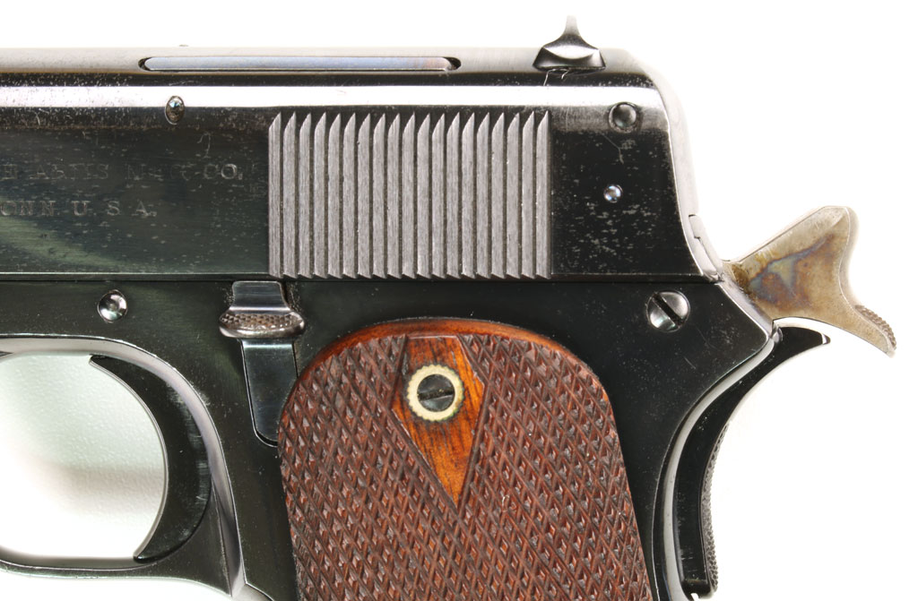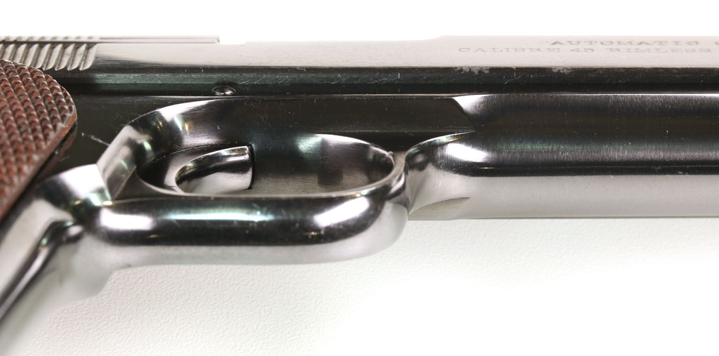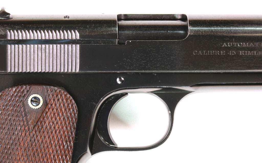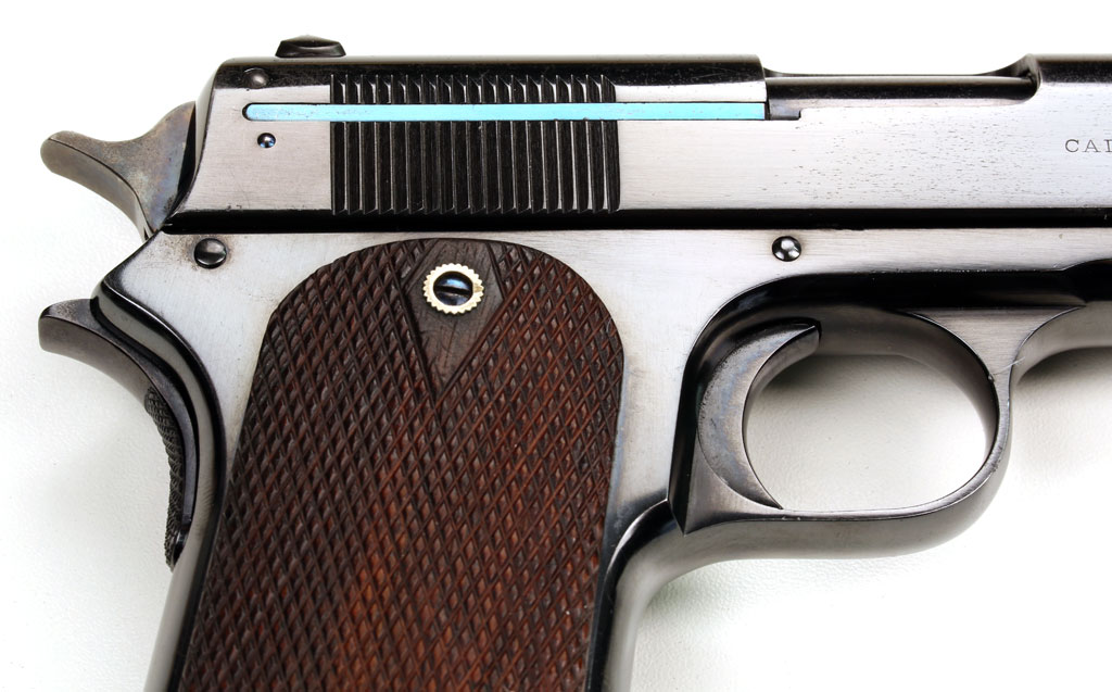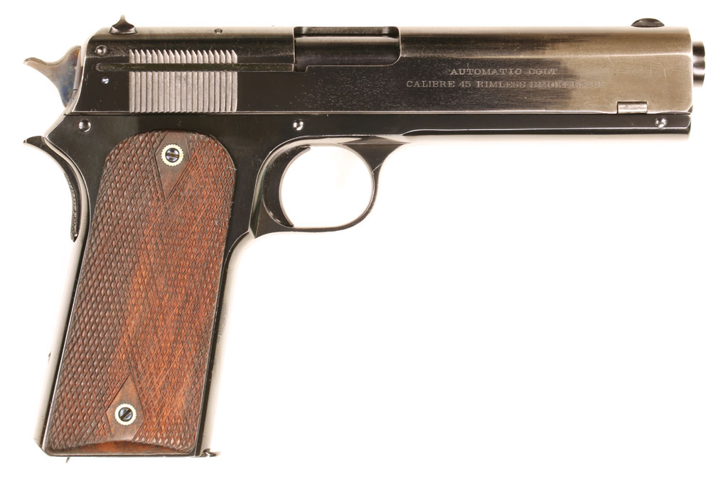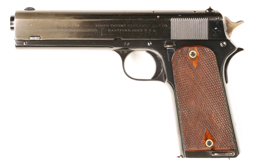 Rob Greer Collection Model 1907 Military Serial Number 19 - 200 .45 cal. No. 1 -200 (inclusive) Modified hammer, Nearly vertical ejection. Auto Indicator to show that chamber is loaded, Auto safety, Strengthened stirrup, and Lengthened trigger stirrup pin. Shipped to the U.S. Government, Springfield Armory, March 17, 1908