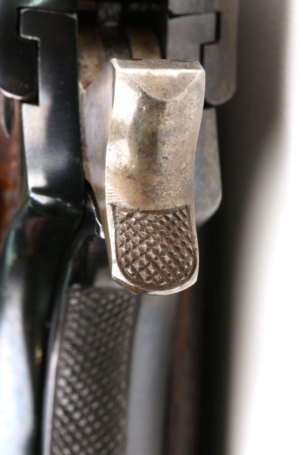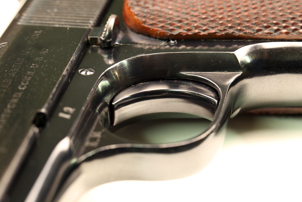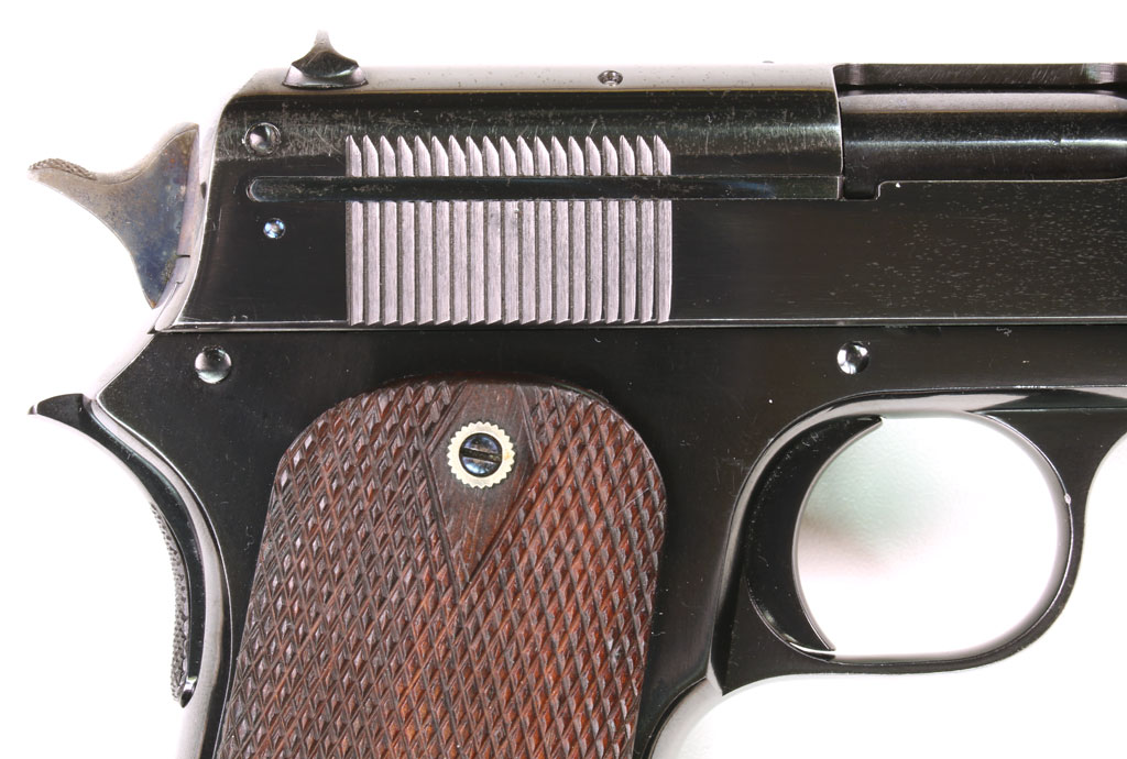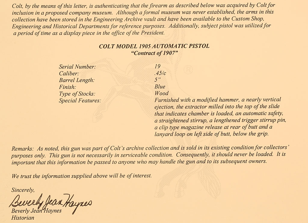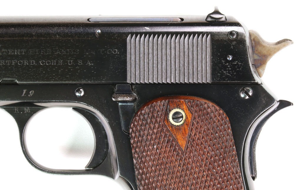 Rob Greer Collection Model 1907 Military Serial Number 19 - 200 .45 cal. No. 1 -200 (inclusive) Modified hammer, Nearly vertical ejection. Auto Indicator to show that chamber is loaded, Auto safety, Strengthened stirrup, and Lengthened trigger stirrup pin. Shipped to the U.S. Government, Springfield Armory, March 17, 1908