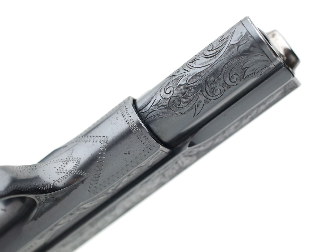 Colt Model 1903 Pocket Hammerless .32 ACP factory master engraved - serial number 382938, factory master engraved by William H. Gough, distinctive five pointed star engraved on rear of frame. This star appears on other known examples of Gough's work.