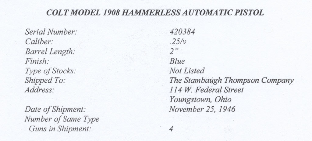 Colt 1908 Vest Pocket .25 ACP serial number 420384 - Pistol has original factory tank blue finish, original and correct second type factory hard rubber stocks and is with original numbered box. This pistol was manufactured ca. 1946 from pre-war parts and features the post war single line slide marking on the left side of the slide. This pistol was shipped to The Stambaugh Thompson Company, 114 W. Federal Street, Youngstown, Ohio on November 25, 1946 in a four gun shipment.