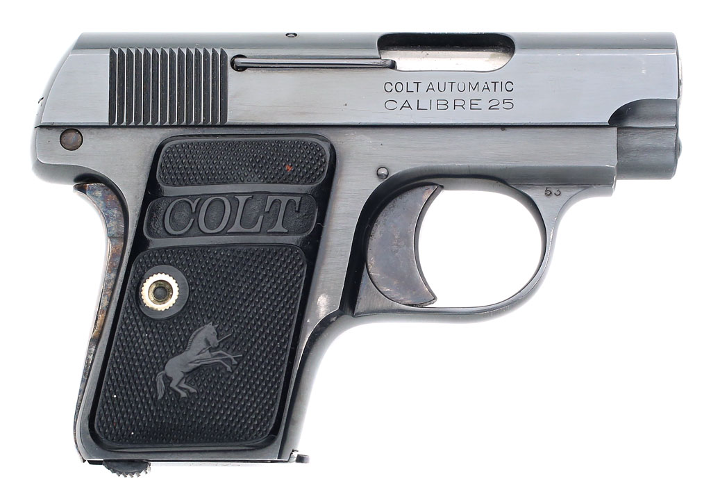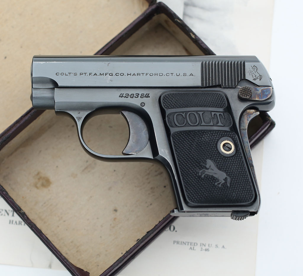 Colt 1908 Vest Pocket .25 ACP serial number 420384 - Many Pre/Post-War examples are accompanied by very noticeable, vivid case colors on the grip safety, thumb safety and trigger.