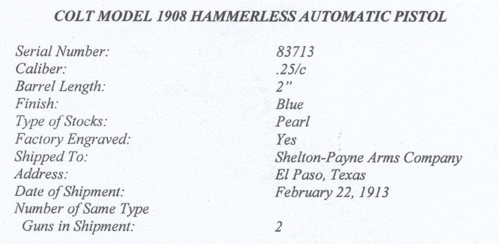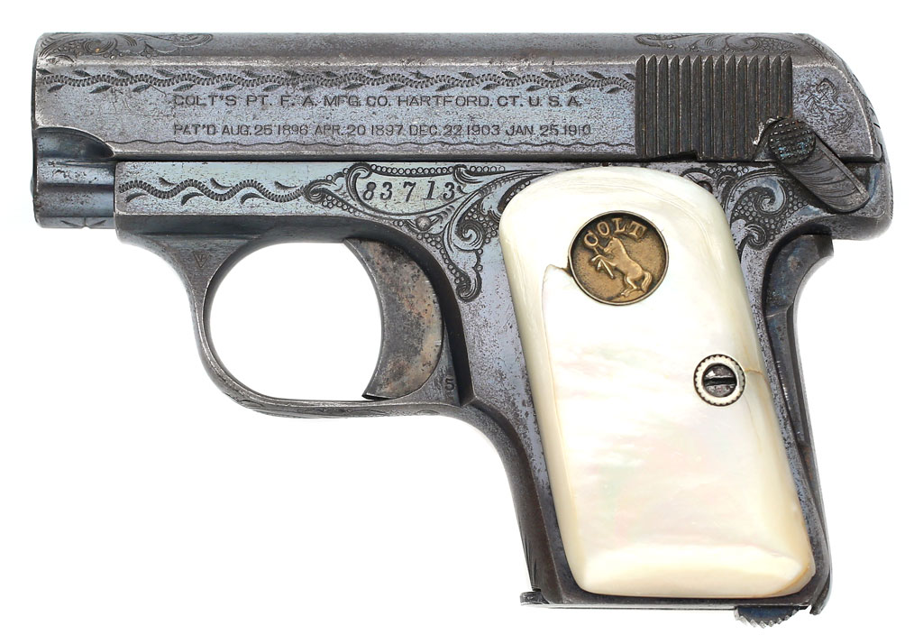 Colt 1908 Vest Pocket .25 ACP serial number 83713 - Pistol is factory engraved ("1 1/4" by Helfricht), has original blue finish and factory recessed medallion round-top mother of pearl stocks. Factory letter confirms this pistol was factory engraved and shipped with mother of pearl stocks to Shelton Payne Arms Co. on February 22, 1913 in a two gun shipment.