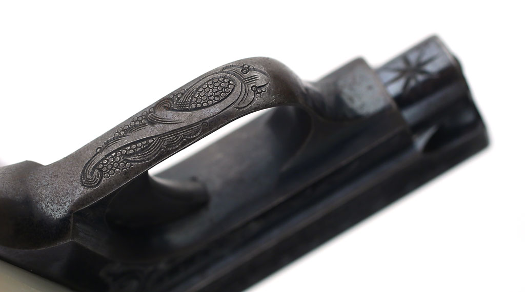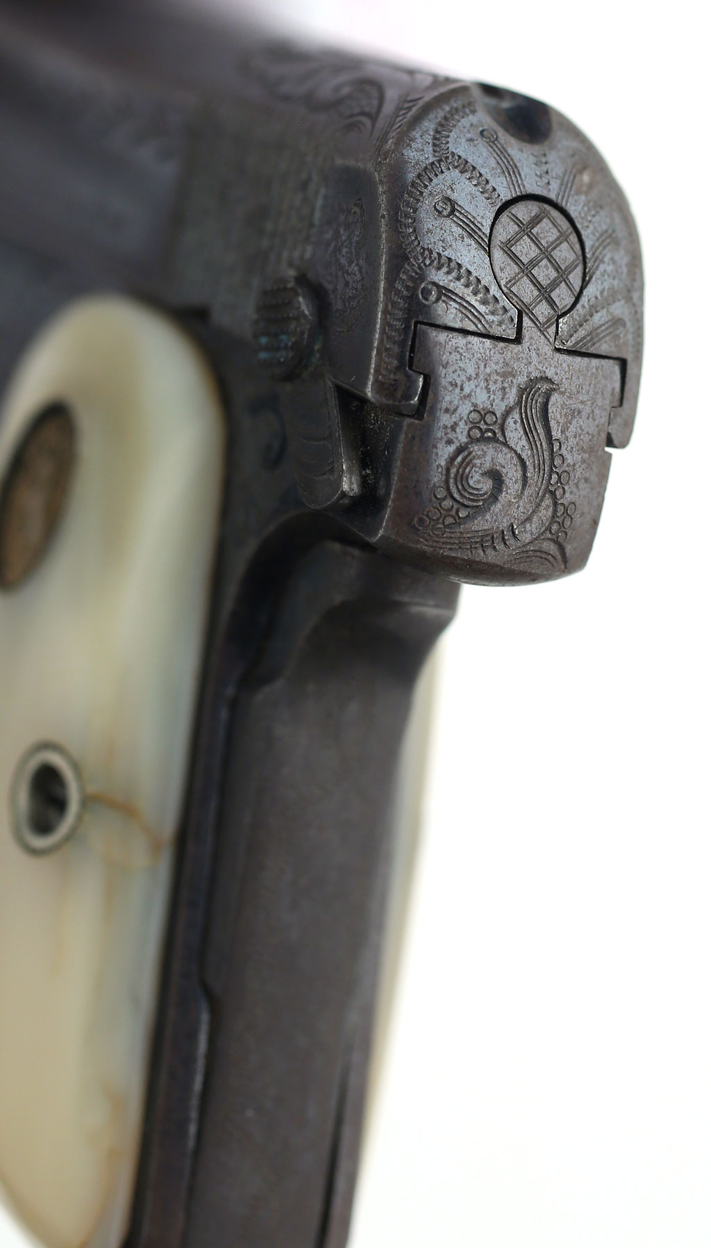 Colt 1908 Vest Pocket .25 ACP serial number 83713 - trigger guard showing engraving. |