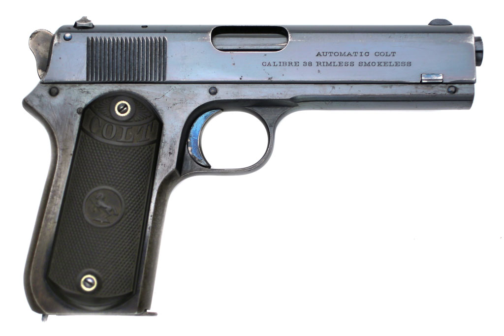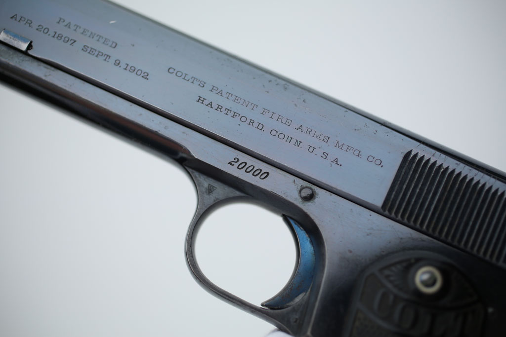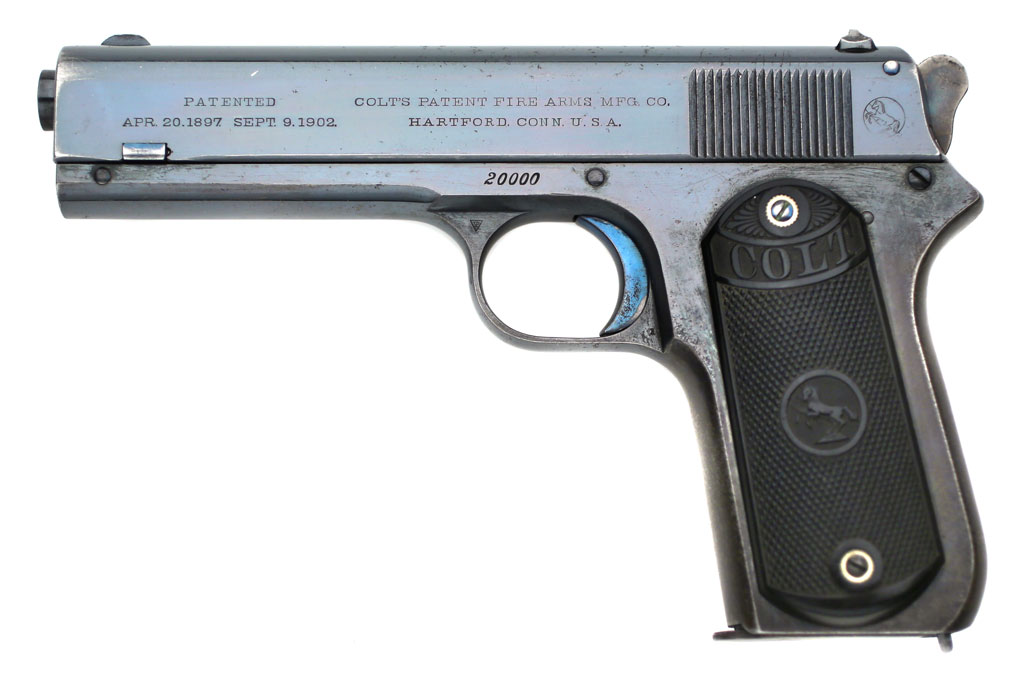 Model 1903 Pocket Hammer .38 ACP serial number 20000 - Pistol features high polished blued finish with fire blued small parts. This pistol was manufactured on September 8, 1906 and shipped September 11, 1906 to Schoverling, Daly & Gales in New York City. There were 5 guns in the shipment. The Colt Model 1903 Pocket Hammer .38 ACP is one of the more interesting early Colt semi-automatic variations for Colt collectors due to Colt's method of assigning serial numbers for this model. Beginning in 1903, the first gun manufactured for commercial shipment was number 19999 and the numbering continued in descending order (19999, 19998, 19997...) until serial number 16000 which was manufactured in 1906.