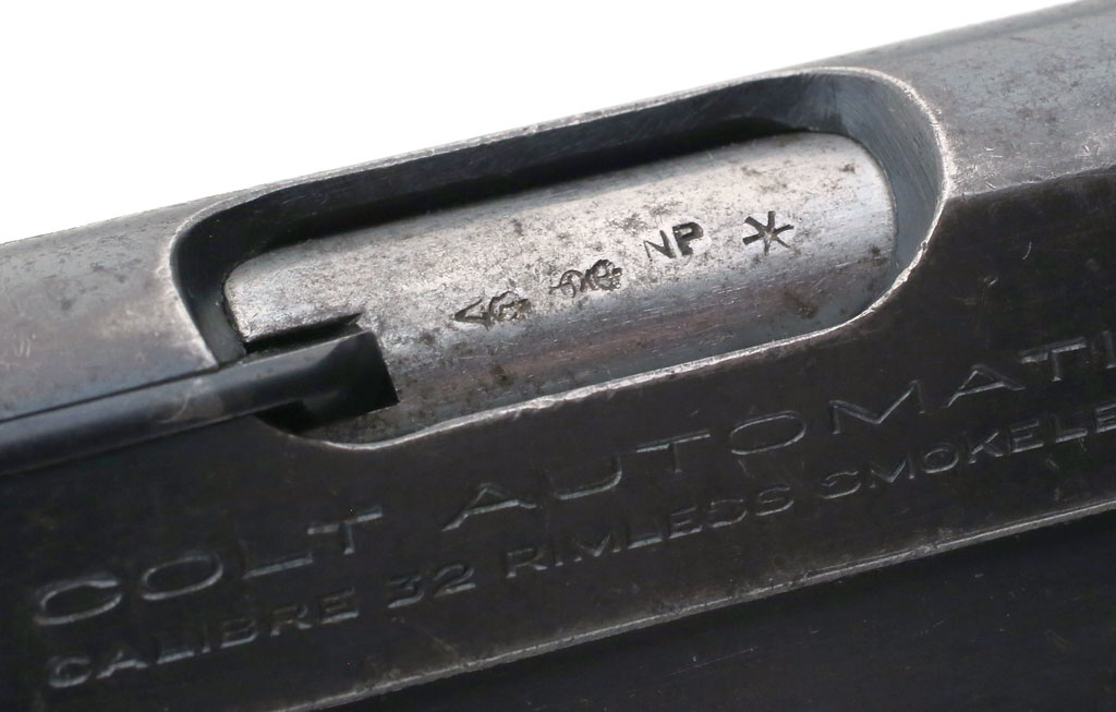 Colt Pocket Hammerless 1903 .32 ACP serial number 378068 (ca. 1921) - note the "4.21" that's been struck through on the right side of the frame just behind the trigger.