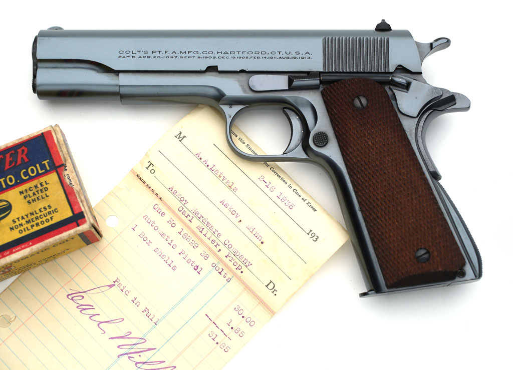 Colt Super .38 serial number 16229 - left side pictured with original sales receipt from February 16, 1935 numbered to the gun. |