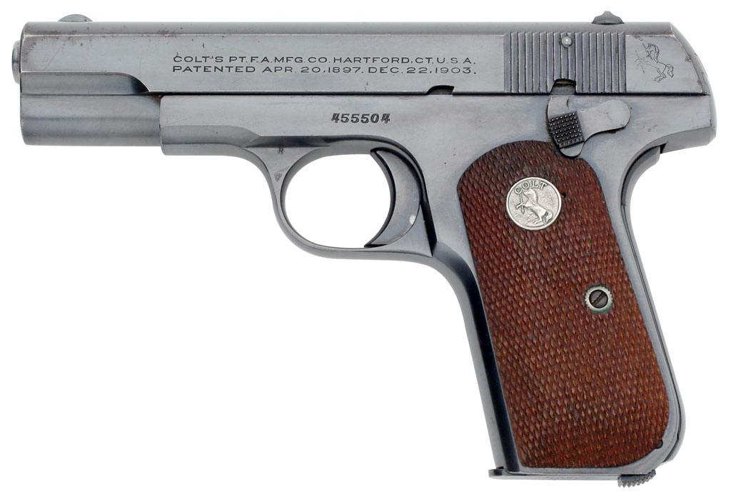 Colt Pocket Hammerless 1903 .32 ACP serial number 455504 (ca. 1924) - Right side This early forward facing flush medallion variation transitioned quickly to Colt's moving to a single style medallion, where the left medallion faces the muzzle and the right medallion faces the rear of the pistol. This was a time saving measure in production since the stock makers only had to worry about fitting one style of medallion. The detail of the flush medallion also evolved over time showing less stippling adjacent to the Rampant Colt on the medallion. The profile of these stocks was also changes which eliminated the point at the toe. |