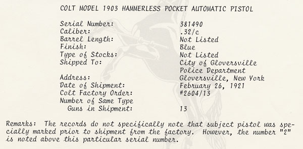 Factory letter for GPD marked Colt 1903 Pocket Hammerless .32 ACP