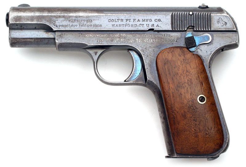 Colt Model 1903 Pocket Hammerless .32 ACP Serial Number 152199 Type III (right side) - grip on left side is a period replacement with the grip type that was introduced around 1916.