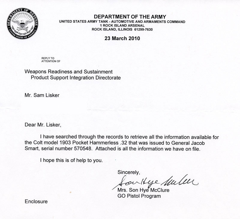 his Colt 1903 .32 ACP caliber sidearm, serial number